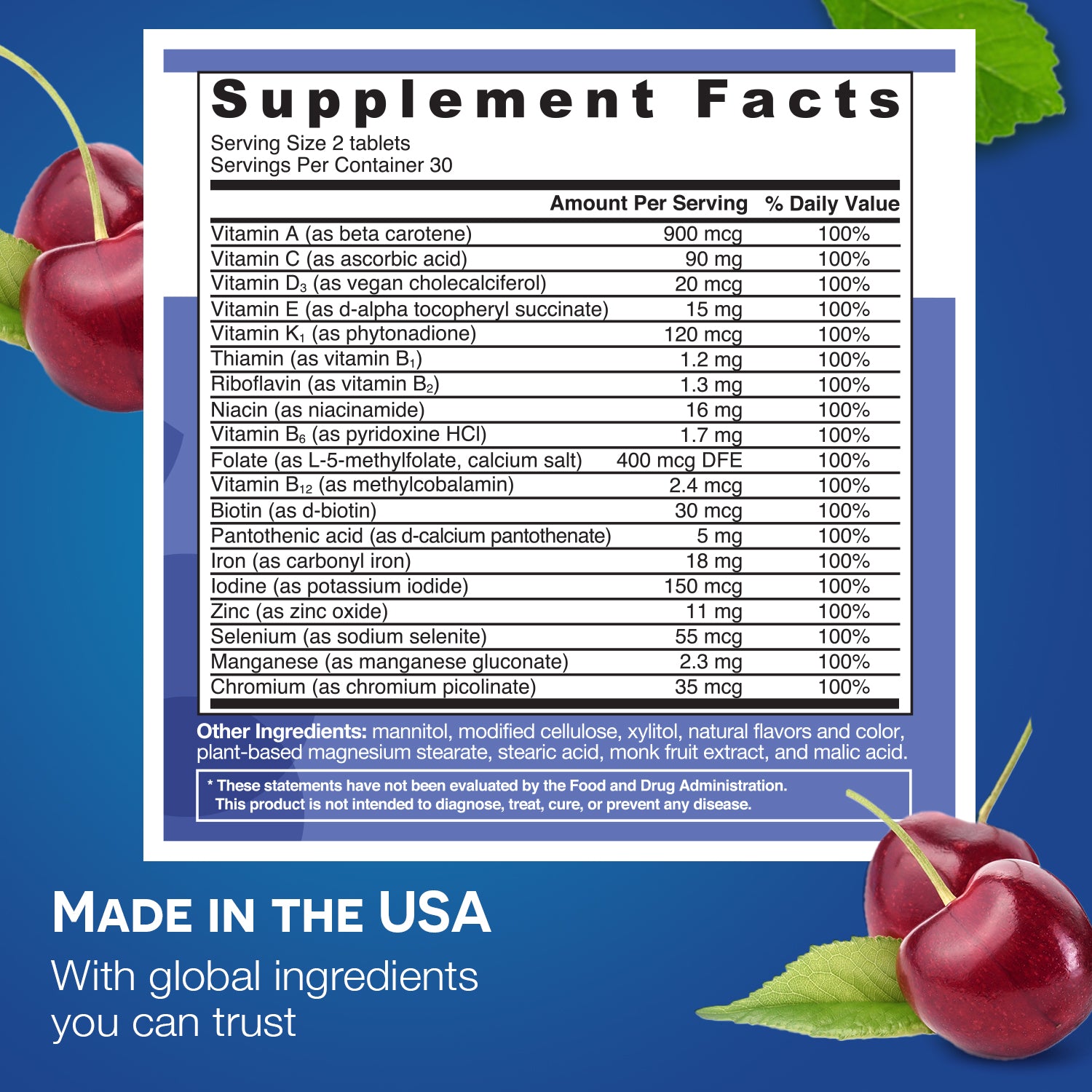 Active ingredients:Â Vitamin A (as beta carotene) - 900 mcg, Vitamin C (as ascorbic acid) - 90 mg, Vitamin D3 (as vegan cholecalciferol) - 20 mcg, Vitamin E (as d-alpha tocopheryl succinate) - 15 mg, Vitamin K (as phytonadione) - 120 mcg, Thiamin (Vitamin B1) (as thiamine HCL) - 1.2 mg, Riboflavin (vitamin B2) - 1.3 mg, Niacin (as niacinamide) - 16 mg, Vitamin B6 (as pyridoxine HCI) - 1.7 mg, Folate (as L-5-methylfolate, calcium salt) - 400 mcg DFE, Vitamin B12 (as methylcobalamin) - 2.4 mcg, Biotin (as d-biotin) - 30 mcg, Pantothenic acid (as d-calcium pantothenate) - 5 mg, Iron (as carbonyl iron) - 18 mg, Iodine (as potassium iodide) - 150 mcg, Zinc (as zinc oxide) - 11 mg, Selenium (as sodium selenite) - 55 mcg, Manganese (as manganese gluconate) - 2.3 mg, Chromium (as chromium picolinate) - 35 mcg