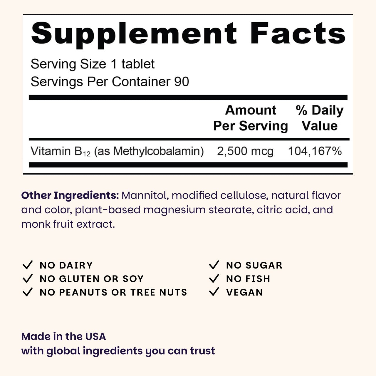 Other ingredients: Mannitol, modified cellulose, natural flavor and color, plant-based magnesium stearate, citric acid, and monk fruit extract