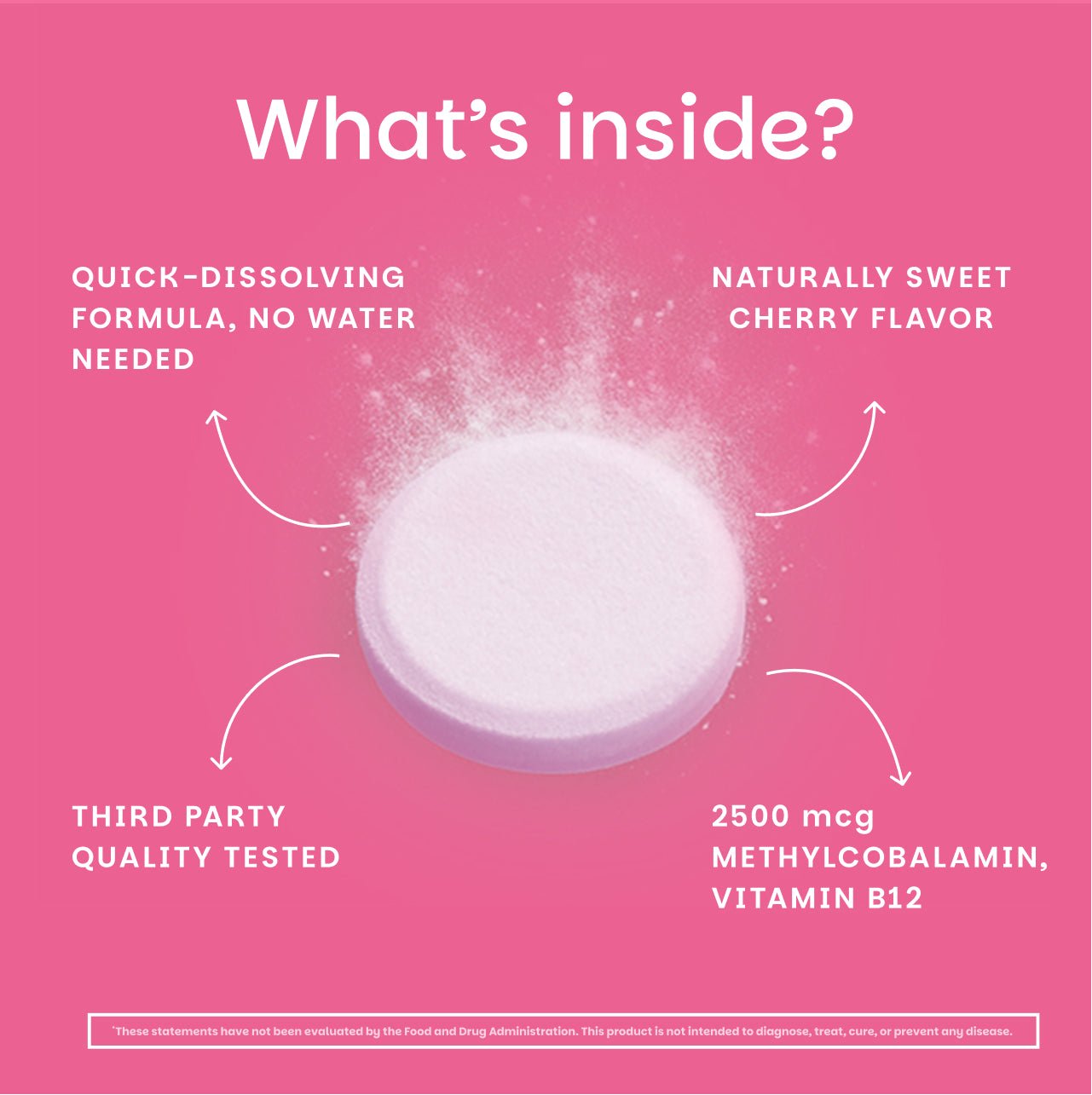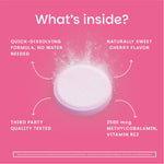 Place the vitamin B12 tablet on your tongue and allow it to dissolve—no chewing and no water needed.